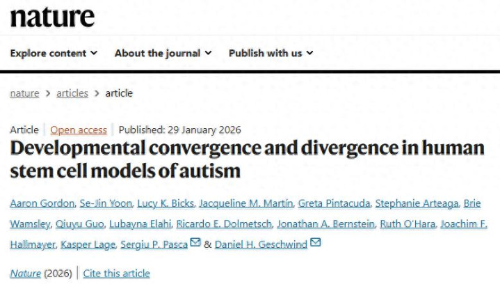 Gordon A, Yoon SJ, Bicks LK, Martín JM, Pintacuda G, Arteaga S, Wamsley B, Guo Q, Elahi L, Dolmetsch RE, Bernstein JA, O'Hara R, Hallmayer JF, Lage K, Pasca SP, Geschwind DH. Developmental convergence and divergence in human stem cell models of autism. Nature. 2026 Jan 29. doi: 10.1038/s41586-025-10047-5. Epub ahead of print. PMID: 41611887.